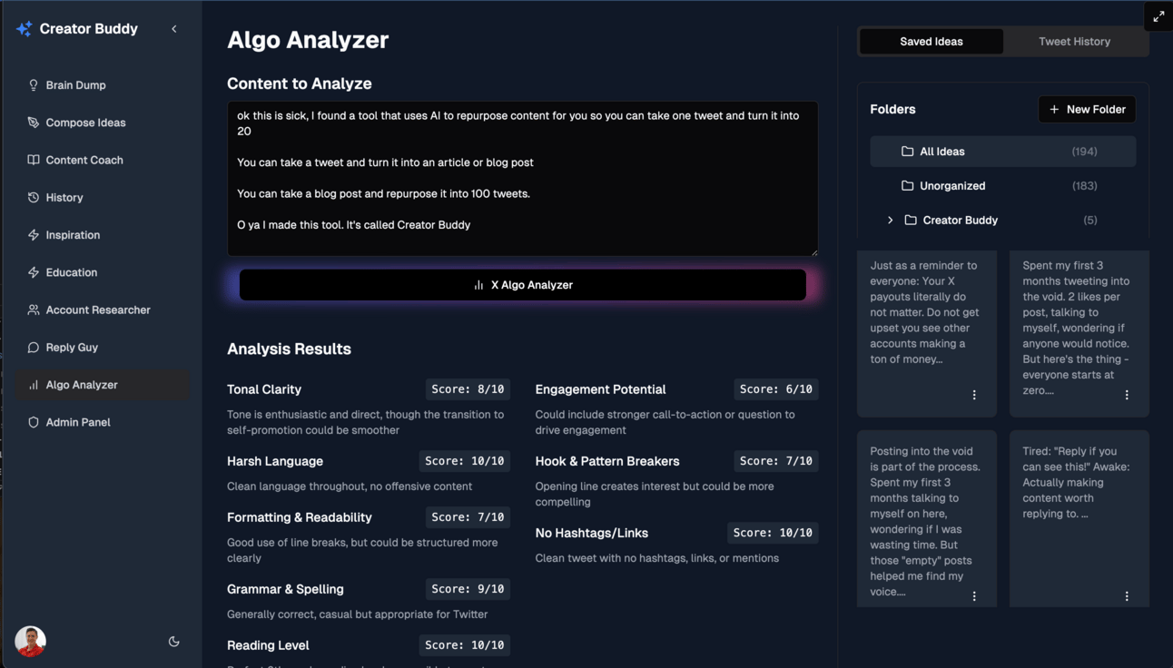 An algorithm analyzer that will take any post you put in and rate it on 9 different algorithm backed metrics. It will tell you exactly what you need to change in order to 100% optimize for the X algorithm. It will also give you alternative versions of your post more in line with what the algorithm is looking for.