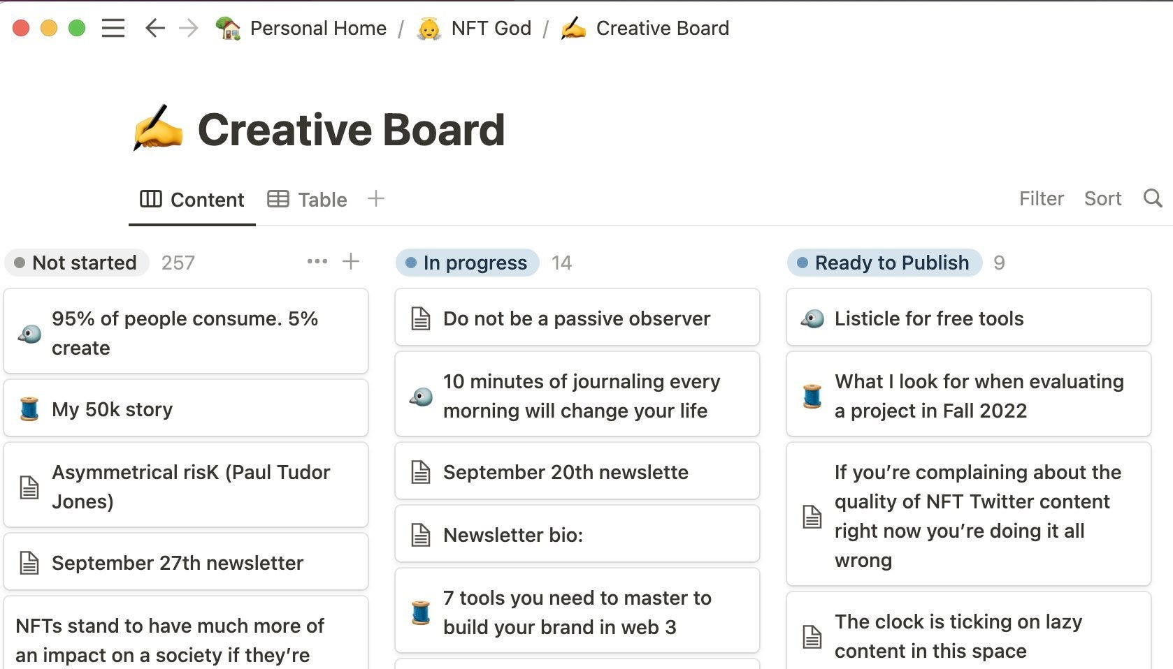 I've set up a creative board in Notion to develop all my ideas after I've captured them. I have four columns: 'not started', 'in progress', 'ready to publish', and 'done'. I transfer all my raw ideas from Mem into the 'not started' column. At night I'll go back into Notion and start developing these ideas. Once I start developing the idea, I move it into "In progress." When a tweet or newsletter idea is fully ironed out, I move it into "Ready to Publish." Then when I've scheduled it for publication, I move it into "done." Building a system like this is critical for being creatively efficient.