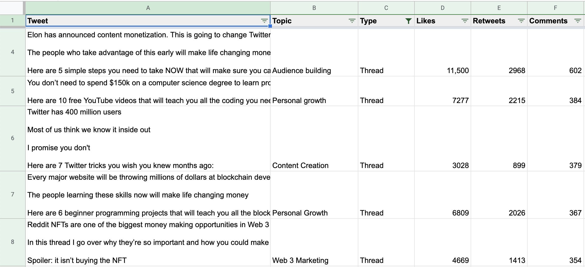 This allows me to determine what my audience enjoys the most. Do they like long tweets? Short tweets? Threads? Listicles? Self-improvement tweets? Web 3 tweets? By having this spreadsheet, I can go back and do analysis on what works the best and think about ways I can improve. I’d highly recommend making a copy of this template I create and filling in your own tweets.